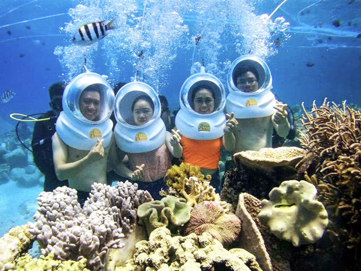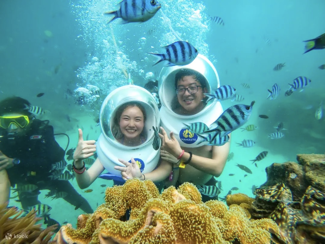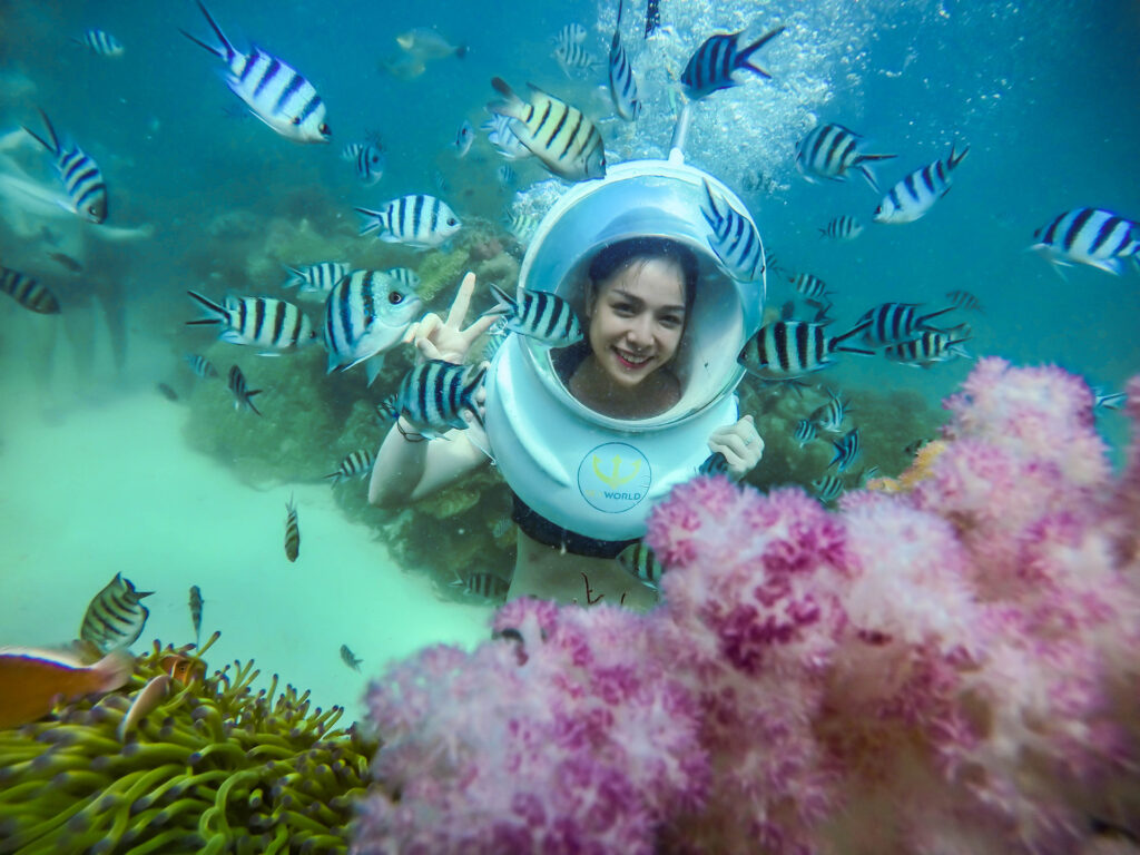 Tại đây, Quý khách sẽ được trang bị đầy đủ thiết bị chuyên dụng (Mũ hoặc bình lặn theo yêu cầu Quý khách) để tham gia tour đi bộ dưới đáy biển Quy Nhơn. HDV chuyên nghiệp luôn theo sát, hướng dẫn và đảm bảo an toàn cho du khách trong suốt hành trình.